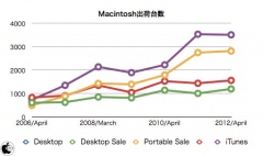 過去の同四半期と比較すると、Macintoshの場合、デスクトップは昨年同期よりも19%増加、ポータブルは昨年同期よりも2%増加、Macintosh全体の出荷台数は7%の増加となり、伸び率は鈍化しているものの売れ続けていることが確認出来ます。