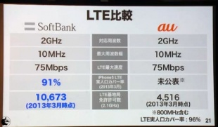 ソフトバンクモバイルの取締役社長 兼 CEOである孫正義氏が記者会見を開き、iPhone 5で利用出来るLTEは2GHz帯だけだと説明し、KDDIのLTEは2GHzと800MHzを合算した人口カバー率で、iPhone 5で利用出来るLTEエリアはソフトバンクモバイルは倍以上だと説明しました。