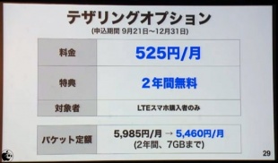 パケットし放題フラット for 4G LTE(5,985円/月)のオプションとして提供される「テザリングオプション」を、525円/月で提供すると発表しています。
