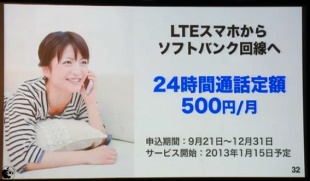 また、LTEスマートフォンからソフトバンク回線に電話利用する場合、国内通話料が24時間無料になる「ホワイトプラン」専用のオプションサービスとして「24時間通話定額」サービスを、500円/月で2013年1月15日から提供開始すると発表しています。
