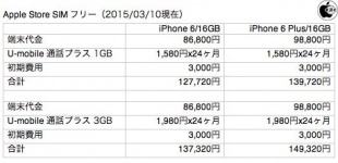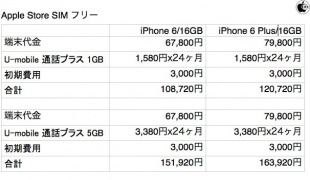 Apple Storeが販売する、SIMフリーの「iPhone 6/16GB」(67,800円)と、「iPhone 6 Plus/16GB」(79,800円)を比較対象として、通話も出来る格安SIM「U-mobile 通話プラス」を使用した場合と、ソフトバンクモバイル、NTTドコモ、KDDIから購入した場合の2年間支払い総額を比較してみました。