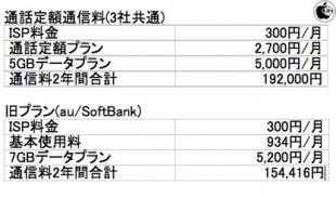KDDIとソフトバンクモバイルの旧プランの場合は、2年間で「154,416円」必要となります。