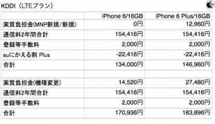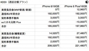 KDDIが発表した「iPhone 6 Plus機種代金」と「iPhone 6 Plus機種代金」を参考に、毎月割月額(24か月)を使用した実質負担金と2年間かかる通信料を計算すると、U-mobile 通話プラス/3GBと比較して約4万〜5万円前後ぐらいの差が出ます。