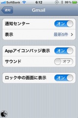従来あったサウンドやバッジの設定が、通知のGmailに移動し、通知センターのオン/オフ(表示数)、Appアイコンバッジ表示のオン/オフ、サウンドのオン/オフ、ロック中の画面に表示のオン/オフが設定可能になっています。