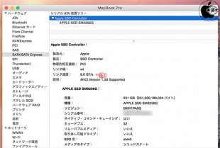 PCIe SSDのリンク幅は「x4レーン」で、フラッシュストレージは、Samsung製「APPLE SSD SM0256G」が搭載されています。