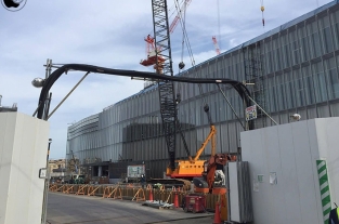 建設地を覆う壁は、部分的に透明のアクリル板が使用されていて、中が見えるようになっています。