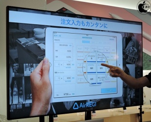 Aireレジ画面を表示しながら、分かりやすいインターフェースで操作可能で、割引クーポン利用といったことも可能だと紹介していました。