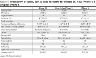 iPhone 5Sは28nmプロセスによるA7プロセッサ、指紋認証センサー、スマートLEDフラッシュなどを採用し、バッテリー容量が1600mAhにアップするとしています。プラスチック筐体にリニューアルされるiPhone 5は、厚みが8.2mmとなり厚くなると予想しているようです。