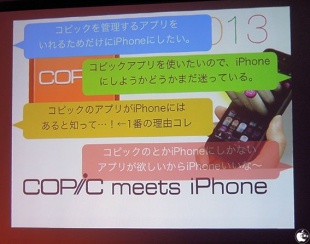 お手持ちのコピック、これから購入予定のコピックをスマートに管理、すばやくブラウズできるiPhoneアプリ「COPIC Collection」も紹介していました。